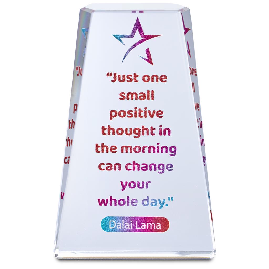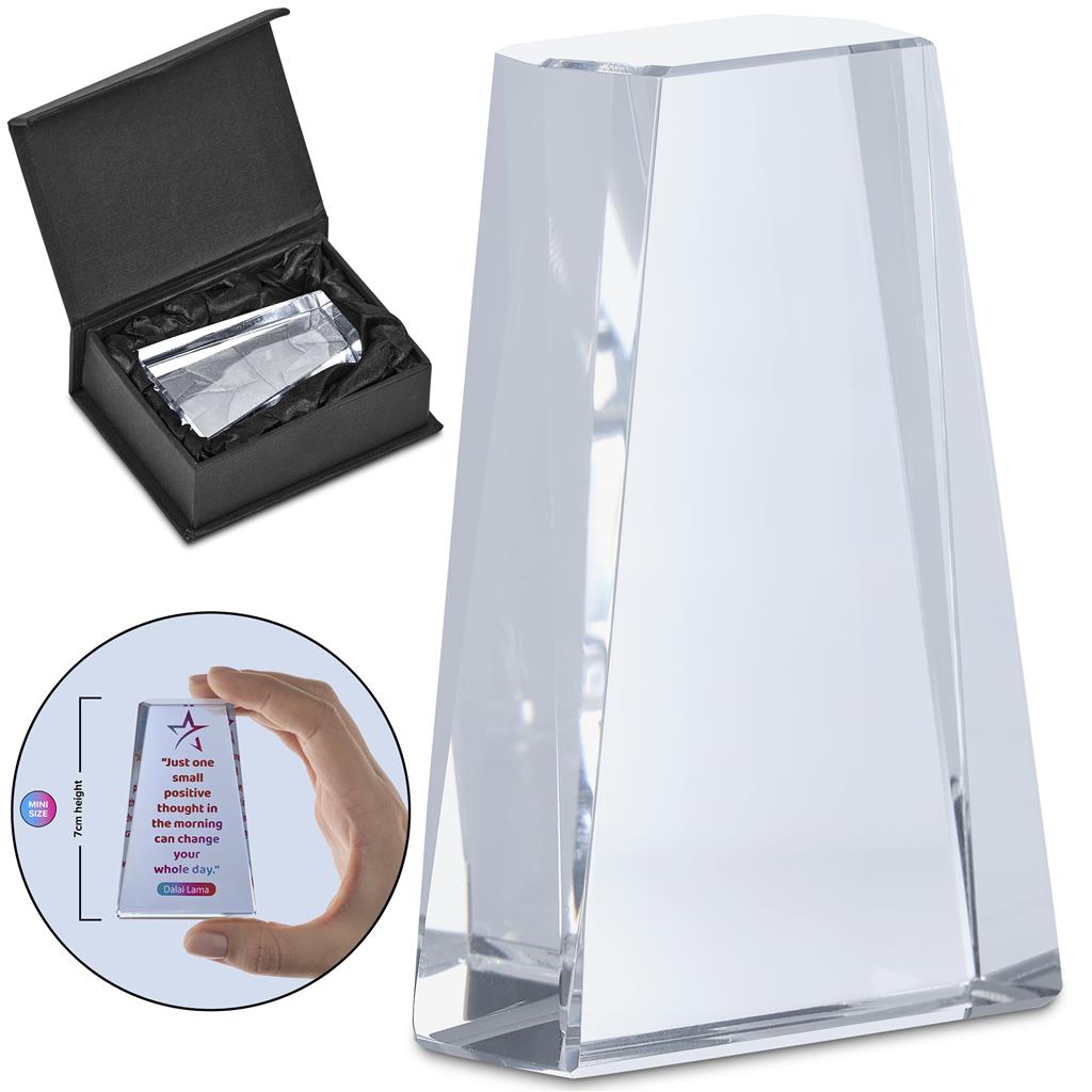 This Mini Award gives employers or suppliers the chance to convey a message that can be kept on the desk or displayed in the office of an employee or client. Ideal for motivational or appreciation messages, these items are offered with colourful digital branding. Each mini award is presented in a smart black box with an elegant and protective padded satin inner.