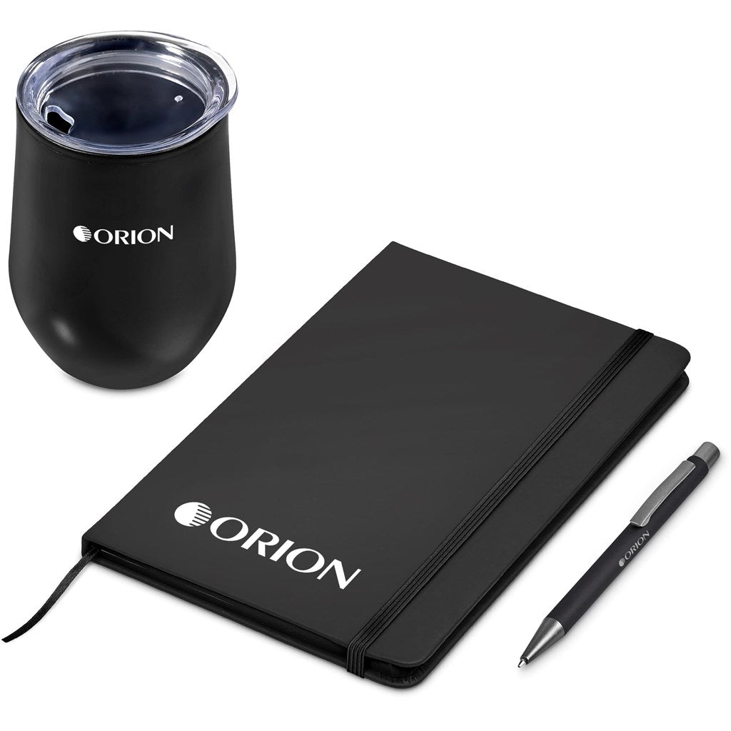 A double-wall tumbler, an A5 notebook with a strap closure and a metal ball pen are neatly presented together in a gift box. The pen has a soft, matte finish and reveals a matte, light grey finish when lasered. This set is suitable as a client gift, or for staff and onboarding of new members to the team. A pre-packaged gift set not only looks impressive, but can also be a convenient and practical option when it comes to transport and delivery.