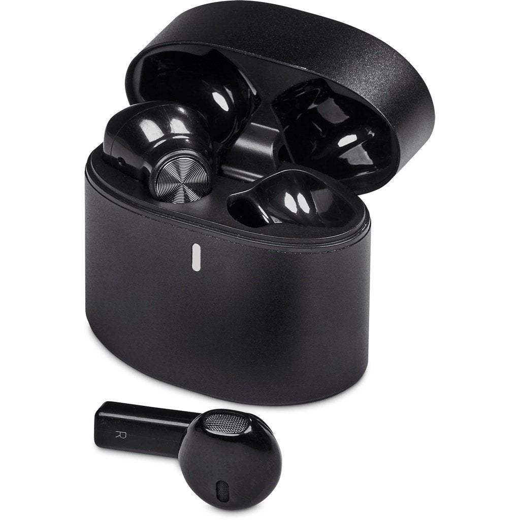 A compact set of True Wireless Stereo Earbuds in a strong and solid metal case. The earbuds provide crisp and clear sound quality, and the microphone picks up your voice clearly when you’re on a call.